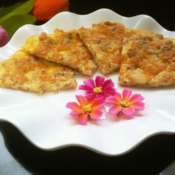 7. After frying, pour the egg cake onto the chopping board and cut it into pieces of appropriate size.