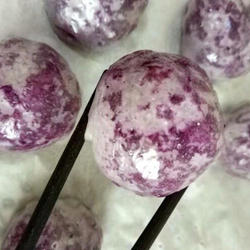 6.Put a spoonful of purple sweet potato puree on the skin, then wrap it into a round shape and press it slightly with your hands;