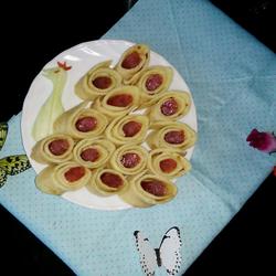 3.The sausage I bought this time is dry, hard, and difficult to cut, so I cut it separately.If it is a sausage that is not too dry, it can be rolled in a pancake and cut in one go.