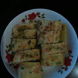 10. When both sides are lightly browned, remove from the pan, roll up the egg cake, cut into sections and serve on a plate