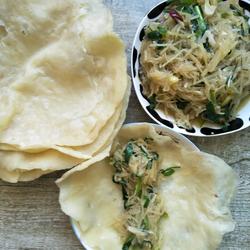 4. Slice potatoes and cut into thin slices Si, now is the time to test your sword skills! Don’t cut the pieces as thick as your fingers, (then you have to bake a big pancake to roll it in)