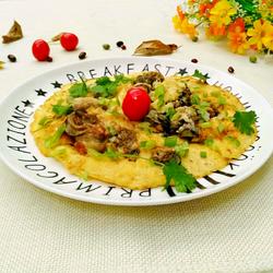 11. Pour in the egg liquid that you just mixed well.In fact, there is some leftover from the two eggs., pour the egg liquid and spread it evenly, making it round like a small pancake.It must be on low fire.