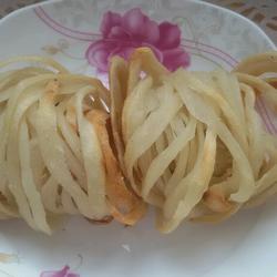 1. Use warm water to soften the flour in advance , apply a thin layer of oil, cover, and let it rest until it rises (the longer the time, the better).After waking up, roll it out with a rolling pin and cut it into thin strips with a knife.
