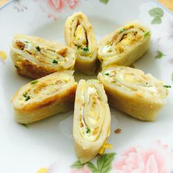 7.When the eggs are solidified, roll up the pancake, add some oil in the pan and fry both sides until golden, then take it out of the pan