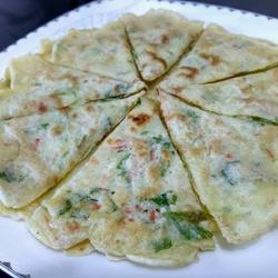 6.Heat a pan with a little oil, scoop a large spoonful of batter into the pan, and smooth it out
