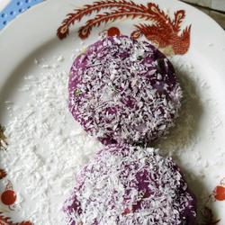 5. Take out a portion and knead it into a ball and compact it into a purple potato cake.