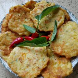 7. Heat the oil in a pan with cold oil.When the oil is hot enough to bubble, use a spoon.Take an appropriate amount of the mixed semi-finished product and fry it.Fry on both sides until golden brown and you are ready to serve!