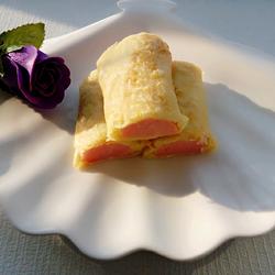 8.After the egg pancake is cooked, add the sausage! Since my sausage is relatively large, I cut it in half vertically and only put half of it