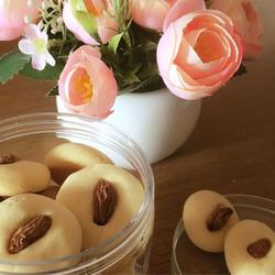 5. Roll the dough into small rounds, flatten them gently, and then Press in the raisins or cranberry prunes one by one (be sure to press lightly so as not to crack the dough)
