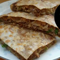 4. Evenly spread the mutton filling, leaving a corner without meat filling.