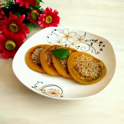 6.Pinch it like a bun , then turn it over and press it into a thin pancake, and pat white sesame seeds on top.