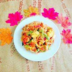 7.Pour the cake into the pot.Continue to stir-fry for five minutes, add salt and chicken essence, and serve on a plate.