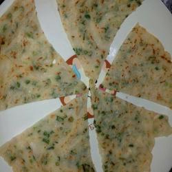 5.Preheat the pan, add a little oil, add two spoons of batter and spread it evenly