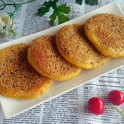 Crush the pumpkin into puree and add glutinous rice flour while hot.The dough can be a little firmer and fried over low heat until cooked through.To avoid burning.