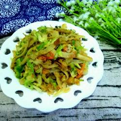 6.Add shredded cabbage and carrots and stir-fry evenly.