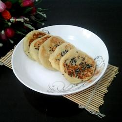 5.Grab a small piece of the mixed dough, roll it into a ball, press it flat and sprinkle with a little black sesame seeds