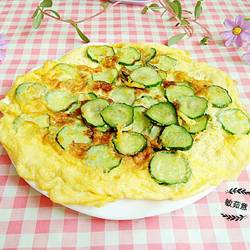 4. Spread the cucumber slices on the egg pancake and fry over medium-low heat