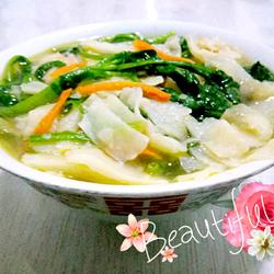 4.Put in water and bring to a boil, then add pancake strips, salt and soy sauce.
