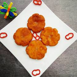 9. Prepare a pan and pour peanut oil into it until it is 70% hot.Put the flower-shaped pumpkin cakes into the oil pan one by one and fry until golden.
