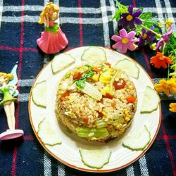 6. After the rice is stir-fried for a few times to color, add the original fried vegetables Pour it back and stir evenly before putting it on a plate.Put it into a small bowl and press it tightly, then place it upside down on the plate.You can stick some cucumber slices around it.