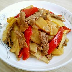 5.Put the meat slices to one side of the pot, add the ginger slices and stir-fry evenly until cooked