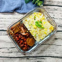 Add the chopped green onion twice to make the rice more fragrant.The simmering process is to make the rice looser and the grains more distinct.The pickles and peanuts are bought from the supermarket and placed in the lunch box.That’s it