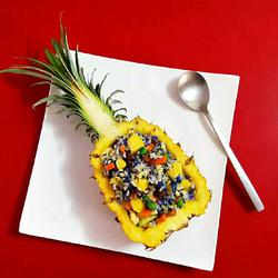 3.It is best to use a non-stick pan for frying.No need to put oil in the pan.Heat the pan directly.Add the sausage and stir-fry, stir-fry the oily juice, add the diced carrots, corn kernels, peas, and a little salt, then add the remaining rice, continue to stir-fry the eggs, finally add the diced pineapple, stir-fry, and add the pineapple.Just inside.