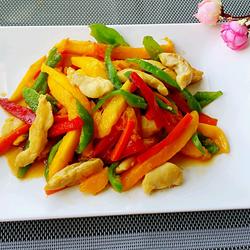 7. Pour in the green and red pepper and stir-fry quickly, add an appropriate amount of salt and five-spice powder, and stir-fry for 1 minute