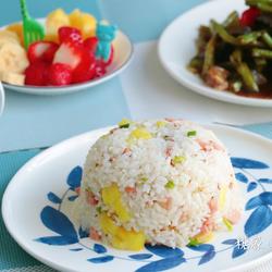 3.Add rice, stir-fry until water is gone, add pineapple, stir-fry for a while.