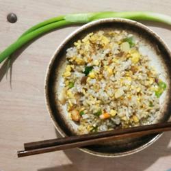 4. Put the onion segments, garlic cloves and shredded ginger into the oil pan and fry until fragrant, then pour in the overnight rice , diced meat and eggs.Stir-fry evenly, add a little salt, sprinkle in chopped green onion and stir-fry briefly before taking it out of the pan.