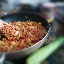 9.Add the scrambled eggs.Add garlic chili sauce and stir evenly.