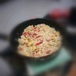 9. After the rice is stir-fried, add the remaining side dishes, salt, light soy sauce, and soy sauce.Smoking, chicken powder, consumption of oil.
