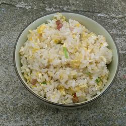 2. Heat a clean pan, shake the oil and pour it out and set aside! Add a little lard again, add the eggs and stir-fry until the water vapor is dry.Add the rice and keep turning it.Use the hand spoon to keep turning the rice so that each grain of rice is soaked in the pot vapor.Fry until it is loose and not soft.When it is hard, sprinkle with chopped green onion, salt, and stir-fry evenly.