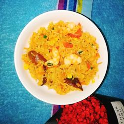 5.After frying the ingredients, add rice, stir-fry evenly, stir-fry for about eight minutes, add an appropriate amount of light soy sauce to season, add green onions and serve