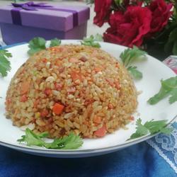 13.Pour in fried rice with eggs, peanuts, sesame seeds and diced chicken