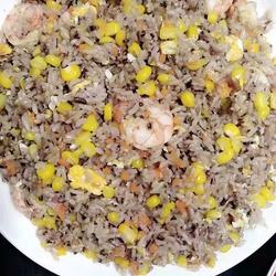 3.Put peanut oil in the pot.When the oil is hot, beat in the eggs and add corn, shrimps, carrots and black rice.Add appropriate amount of soy sauce, salt, and mix well