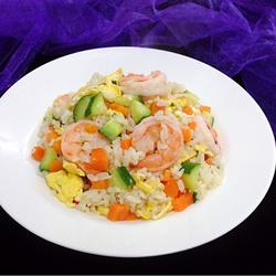 9. After all the rice is stir-fried, add an appropriate amount of salt and add the pre-fried shrimps.Quickly stir-fry diced carrots, eggs, pre-cut cucumbers (cucumbers do not need to be fried in advance), and chives.