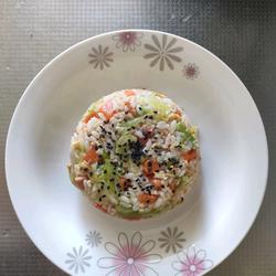 10. After the rice is heated and completely dispersed, add a little light soy sauce, white pepper, and a few drops to taste Very fresh, continue to stir-fry, add a little salt at the end, and take it out of the pot.Pour the fried rice into a bowl and compact it, invert it onto a plate, and sprinkle with a little black sesame seeds.