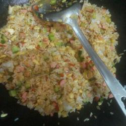 3. Put the scooped eggs in and stir-fry with the cucumber, then add the leftover rice and stir-fry Add soy sauce.