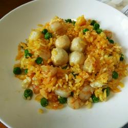 8.When the rice is cooked, put the ingredients you just prepared into the pot.Stir fry together over high heat.