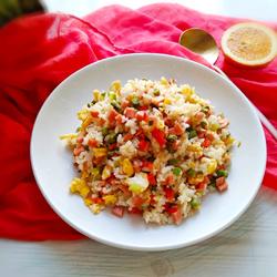 14. After the rice is stir-fried, add diced bell pepper and stir-fry for a while.