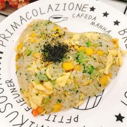 8.Pour into a heart-shaped bowl and invert on a plate , sprinkle some shrimp and black sesame powder on the fried rice to supplement calcium and enhance the flavor