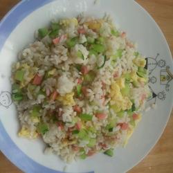 1. Dice the ham and cucumber and set aside, beat the eggs2.Heat the pot and add oil, scramble the eggs first, and fry the eggs into small pieces