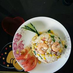 2. Let the bottom of the pot swim a little, sauté a little chopped green onion, add diced squid and fry for 6 minutes until cooked, add shrimp.Fry and change color.Add corn kernels, diced ham and peas.Continue stir-frying