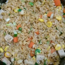 3.Put some oil in the pot.When the oil is hot, add the rice and fry until the egg liquid is completely dry.Add an appropriate amount of soy sauce and stir-fry.
