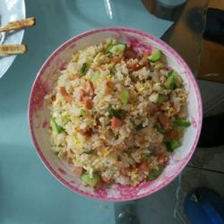 3. After the eggs are fried, add cucumber, sausage, chicken fillet and stir-fry evenly.Add rice? Stir-fry, add salt, chicken essence, stir-fry and serve.