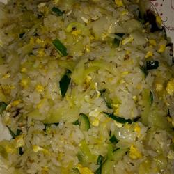 4. First fry the eggs, add cabbage and stir-fry for a while, then add rice, and finally add cucumbers and leeks
