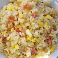 Heat a little oil in a pot, pour in the egg liquid.When the egg liquid is almost solidified, immediately pour in the rice and add the ham.