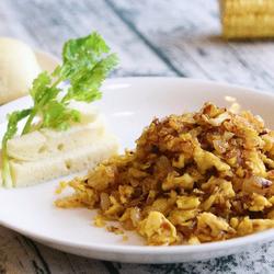 7. Stir-fry the eggs quickly before solidifying, so that the eggs spread and the wild rice is saturated.First, add a little chicken essence and change the heat to medium.