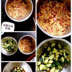 1. Slice the green onion, chop the garlic and ginger, put it in a red pot.When the pot is red, put an appropriate amount of oil.When the oil turns red, add the chopped onion, ginger and garlic.Add a small amount of salt and soy sauce, then add the onion to the pan and stir-fry.Stir-fry for 1-2 minutes.Add the cooked beef and cooked rice and stir-fry for 3-4 minutes.Test the saltiness and add an appropriate amount of salt and MSG.Remove from the pan